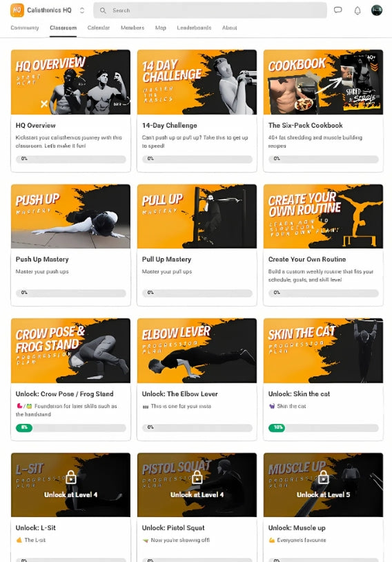 Structured courses designed to help you master calisthenics step by step. From beginner progressions to advanced skill paths, these online calisthenics courses combine weekly programming, video lessons and community support so you build real strength, clean technique and visible results. Train at home, in the park or at the gym, all included with your Calisthenics HQ membership.
